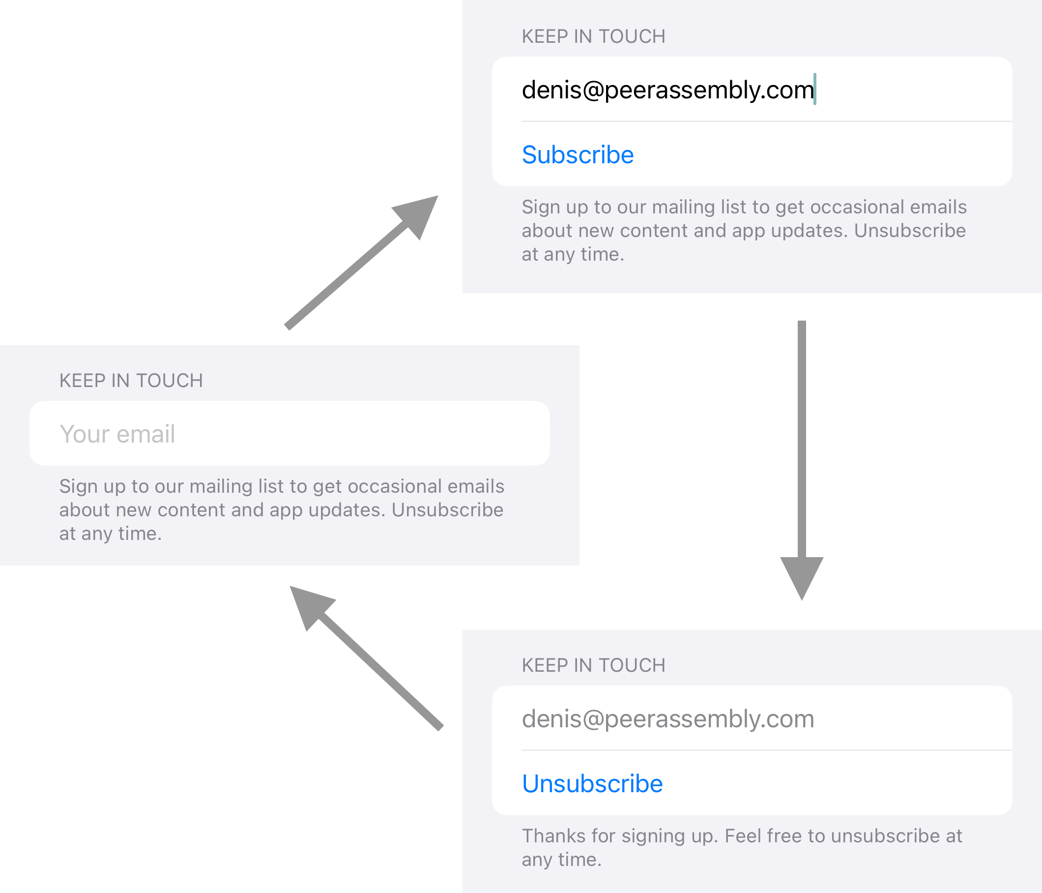 InApp Mailing Lists acts as a bridge between your mobile app, and your mailing list platform. It provides a simple API which you can use to easily subscribe and unsubscribe email addresses. It then automatically mirrors those changes into the mailing list platform you're using. Importantly, all this is done without needing to embed any API credentials from your mailing list platform into your app.